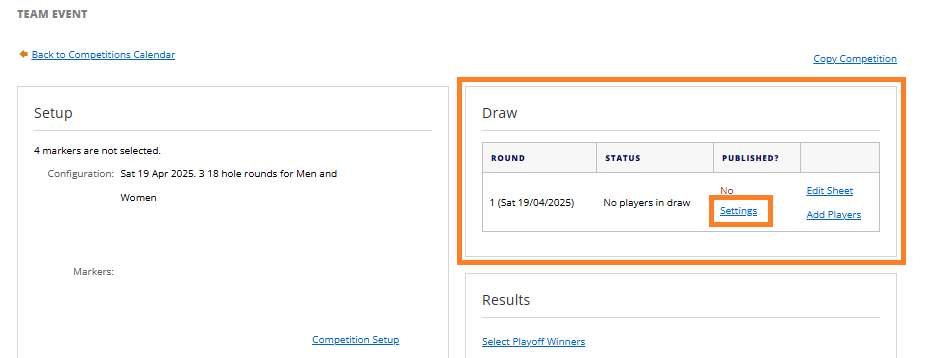 1. After creating the draw sheet and adding the players, select Settings under the 'Draw' area in the competition.